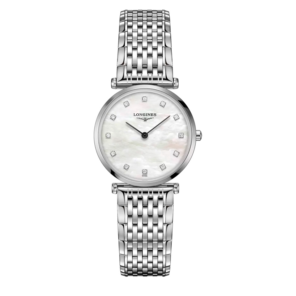 El Longines Grande Classique es un reloj en caja de acero de 34 mm, mecanismo suizo de cuarzo, esfera blanca nacarada y engastada con 12 diamantes Top Wesselton VS-SI, con un total de 0.081 quilates. Brazalete en acero con triple cierre desplegable de seguridad con mecanismo de apertura mediante pulsador.