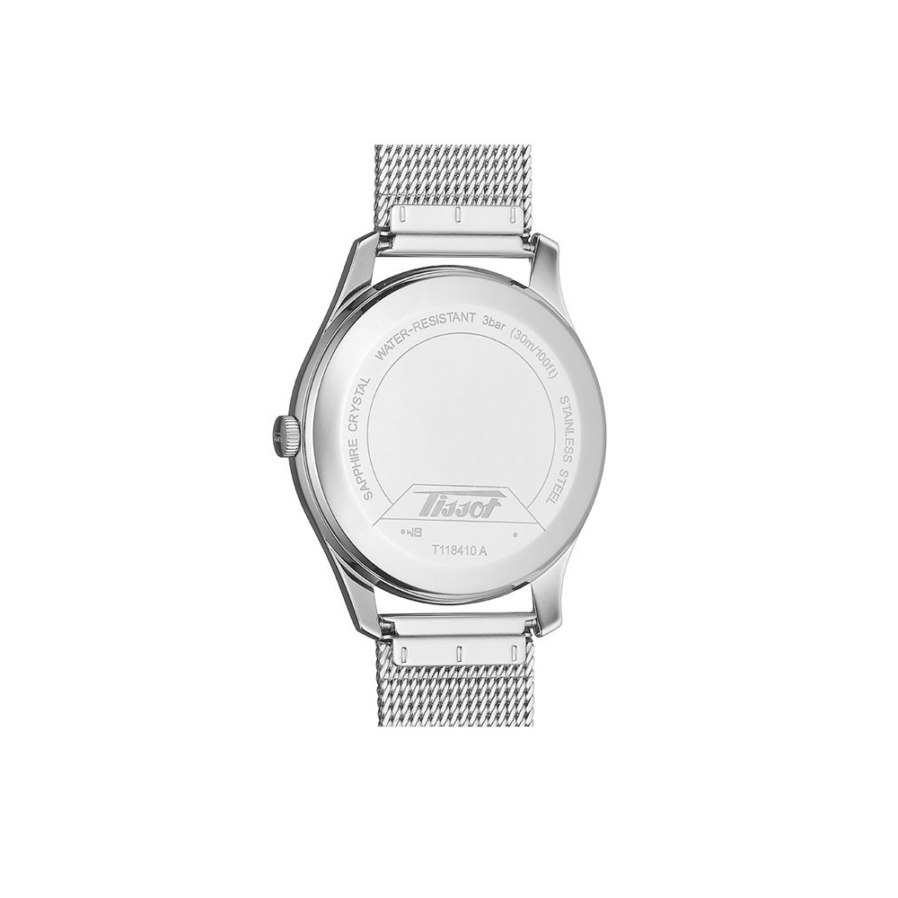 Reloj en caja de acero de 40mm con mecanismo de cuarzo, esfera de color plateado y ventana con indicación del día del mes, brazalete de malla milanesa en acero inoxidable con cierre tipo joya.